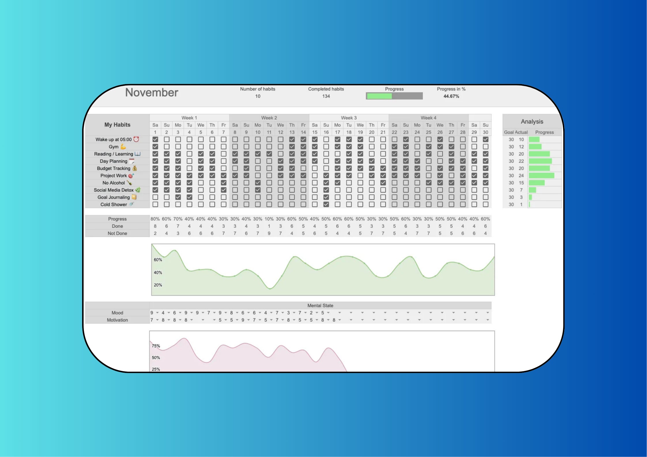 A simple, visual Monthly Habit Tracker for Google Sheets & Excel that helps you stay consistent without pressure or overwhelm.